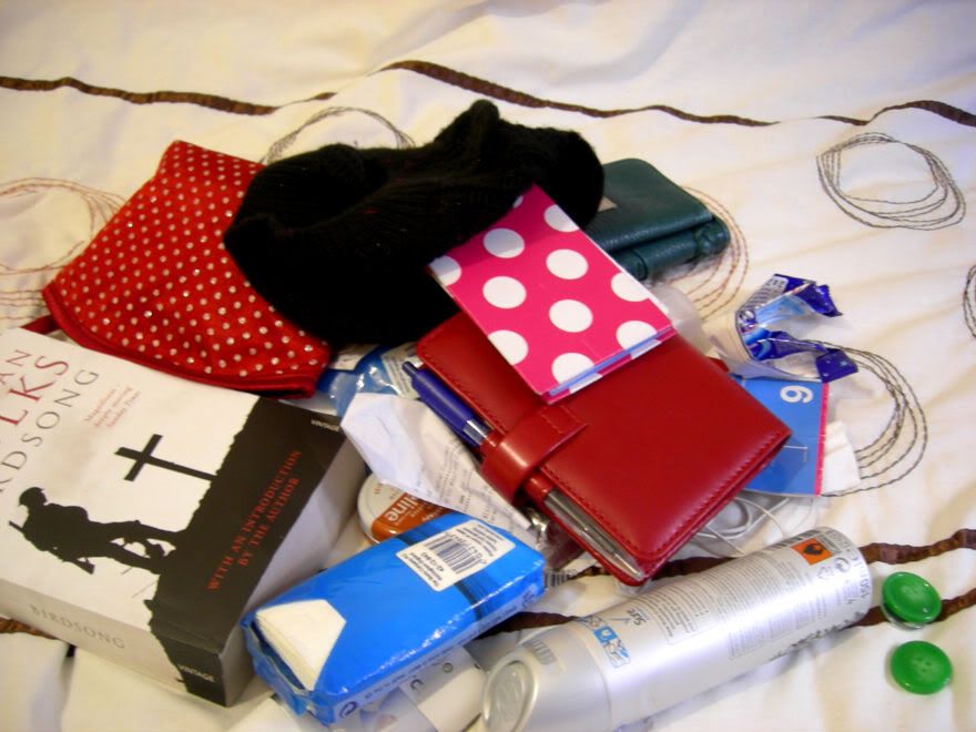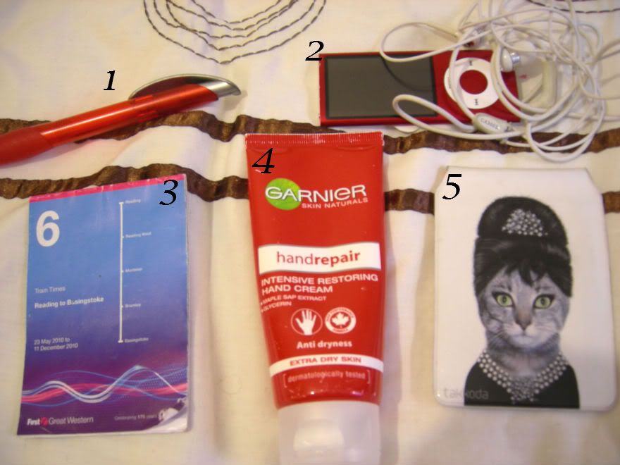 1. Random pen. 2. Ipod Nano, quite beaten up after only having it for a year! 3. Train timetable, although I pretty much know the timings. 4. Rather good handcream 5. Railcard holder