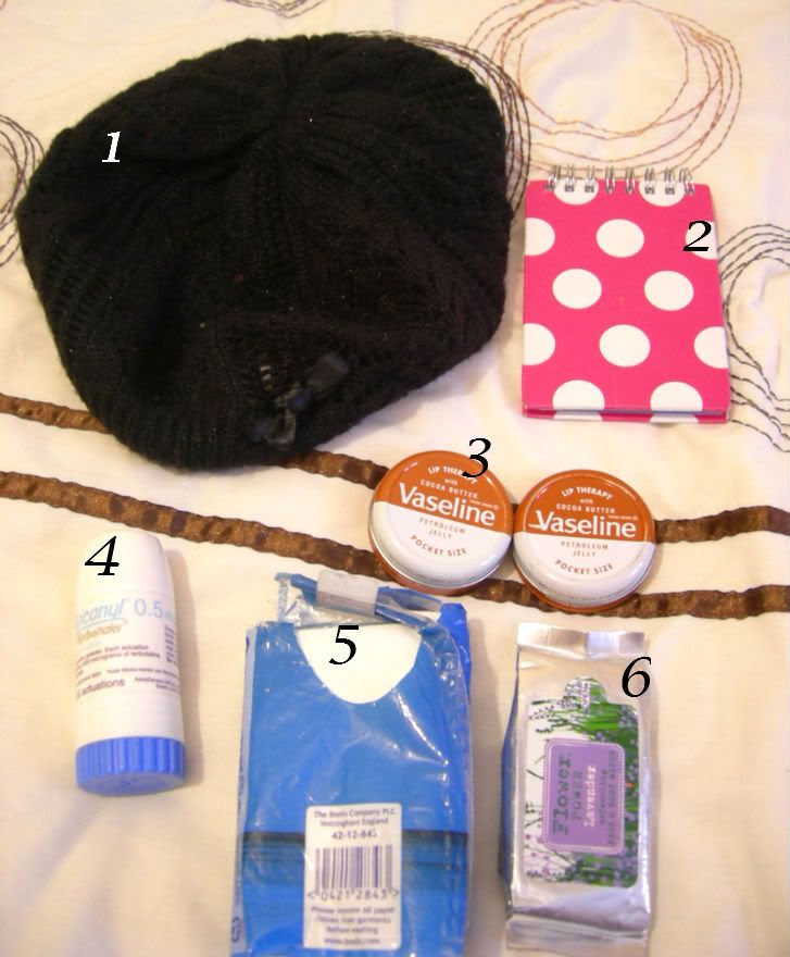 1. Essential hat for the cold weather! 2. Little notebook for messy ramblings. 3. Two of the yummiest lipbalms... it smells like caramel! 4. Inhaler for asthmatic moments. 5. Tissues! 6. Lavender scented wipes, which I've never used but stay in my bag!