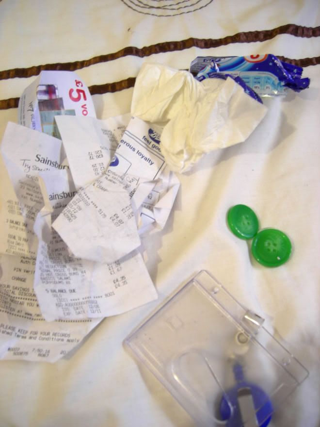 All the rubbish in the bottom! Receipts, buttons, chocolate bar wrapper, work card holder, and a manky used tissue!